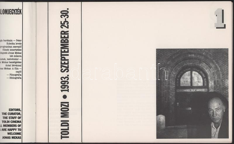1993 Jonas Mekas (katalógus), Toldi Mozi, 1993. szeptember 25-30. Szerk.: Antal István. Kiadói tűzött papírkötés, 28 p.
