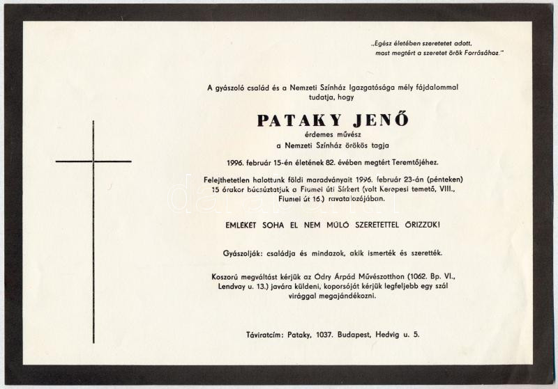 1996 Pataky Jenő érdemes művész (1914-1996) halálozási értesítője