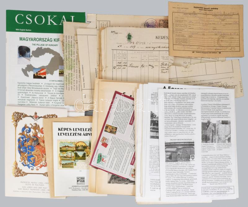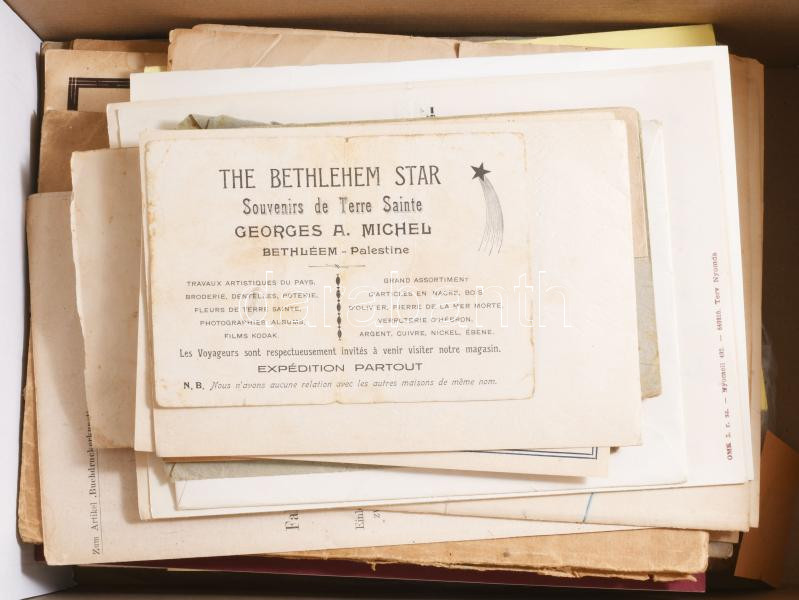 Cipősdoboznyi papírrégiség tétel, benne sok képeslapos vonatkozású szakirodalom, iskolai értesítők, bizonyítványok, stb