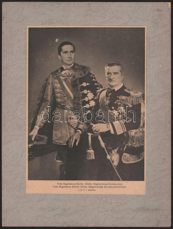 cca 1930-1940 Vitéz Nagybányai Horthy Miklós kormányzó és fia, Vitéz nagybányai Horthy István kormányzóhelyettes díszmagyaros portréja, papír kartonon, kopásnyomokkal, 27x19 cm, karton: 36x27 cm