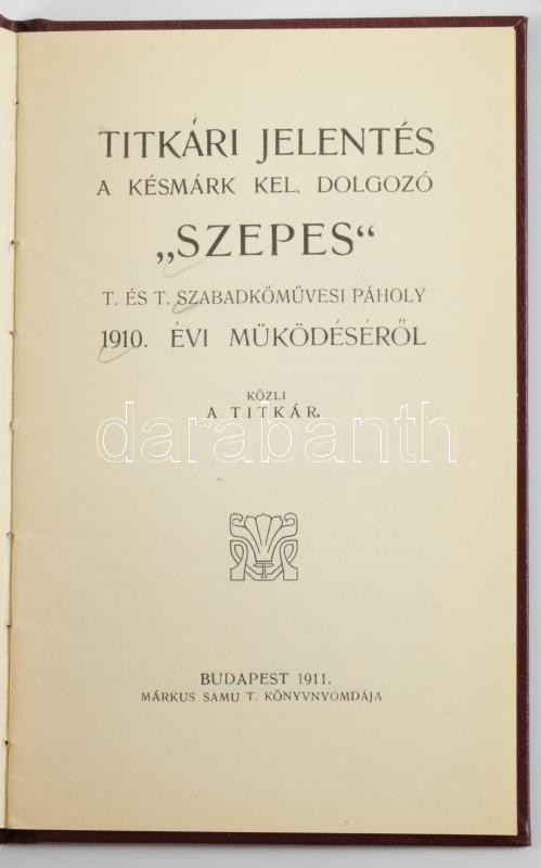 Titkári jelentés a Késmárk kel. dolgozó ,,Szepes" t. és t. szabadkőműves páholy 1910. évi müködéséről. Bp., 1911, Márkus Samu-ny., 22 p.