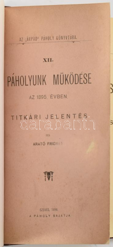 Arató Frigyes: Páholyunk müködése az 1895. évben. Titkári jelentés. Az ,,Árpád" páholy könyvtára XII. Szeged, 1896, Bába Sándor-ny., 70 p.;