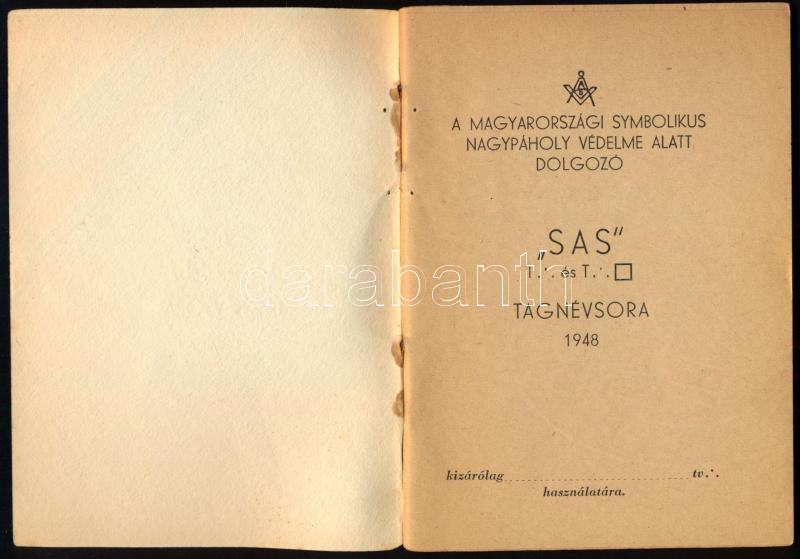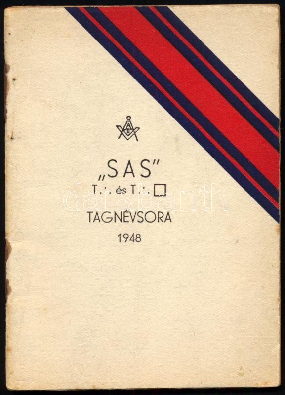 A Magyarországi Symbolikus Nagypáholy védelme alatt dolgozó ,,Sas" t[örvényes] és t[ökéletes] páholy tagnévsora 1948. Bp., Otthon-ny. A páholytagok névvel és cÃmmel ellátott listája. Kiadói tűzött papÃrkötés.