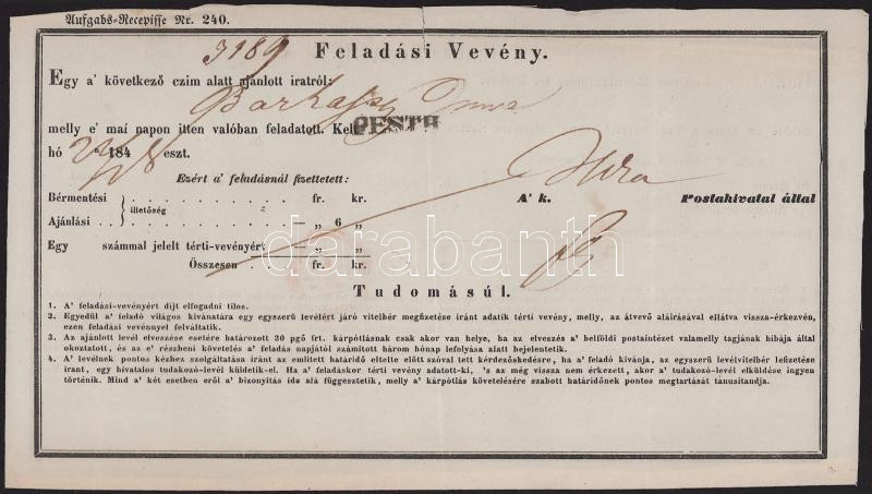 1848 Feladási vevény Barkassy Imre (1805-1871), Tormay Cécile (1875-1937) írónő anyai nagyapjának nevével