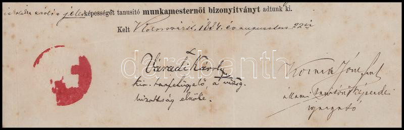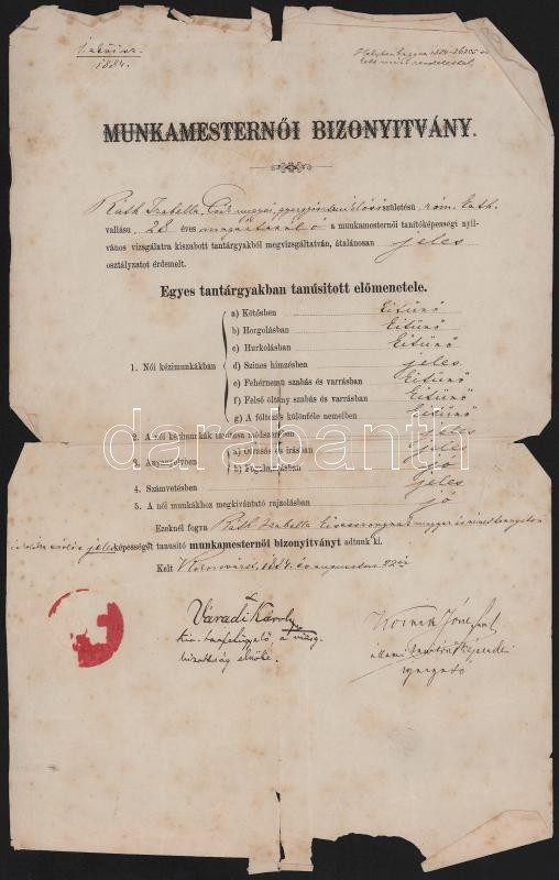 1884 Kolozsvár, a Kolozsvári Állami Tanítónőképezde által kiállított munkamesternői bizonyítvány, Váradi Károly (1841-1886) Kolozs megyei tanfelügyelő és Kozma József igazgató aláírásával, sérült, 37x23 cm