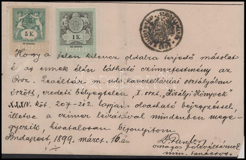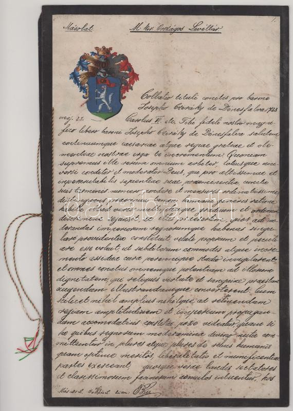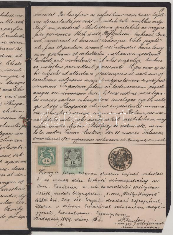 1899 A dénesfalvai Cziráky család címeres levelének (armalis) másolata, kézzel rajzolt címerrajzzal. 1899. 10 beírt oldalon, 5+1K illetékbélyeggel