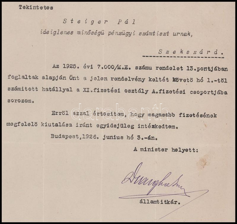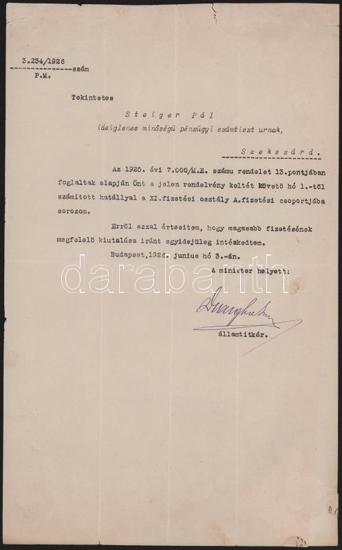 1926 Bp., Vargha Imre (1876-1945) pénzügyi államtitkár (1931. júliusától decemberig adminisztrációs vezető miniszteri hatáskörrel) autográf aláírása kinevezésen, lapszéli szakadással