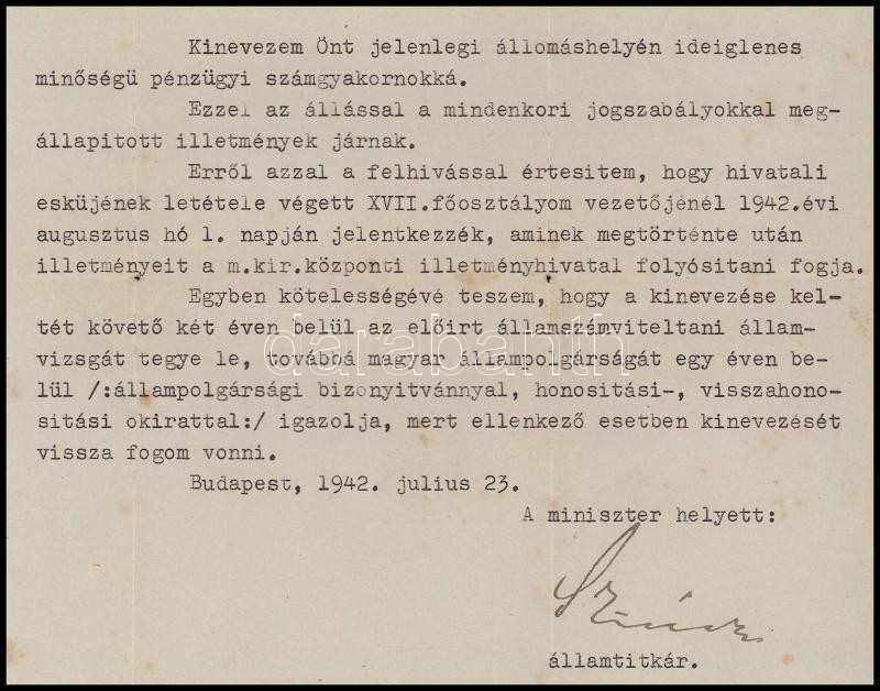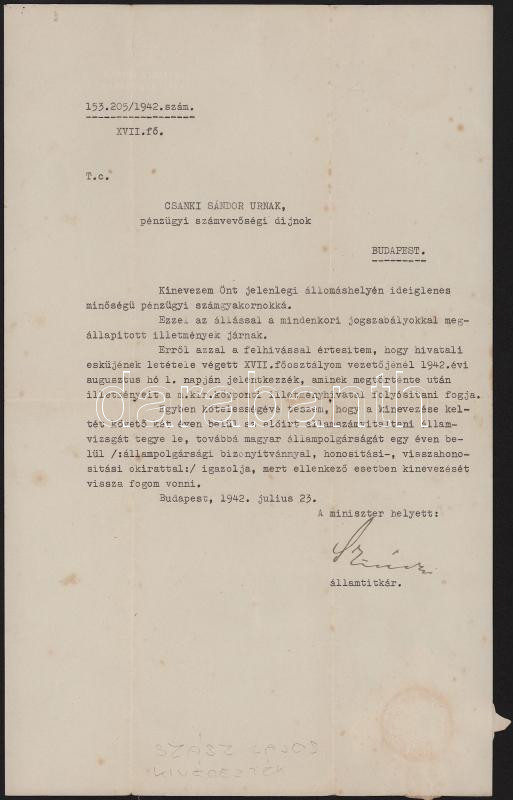 1942 Bp., Szász Lajos (1888-1946) államtitkár, később iparügyi, illetve kereskedelem- és közlekedésügyi miniszter, a Sztójay-per egyik kivégzettjének autográf aláírása kinevezésen