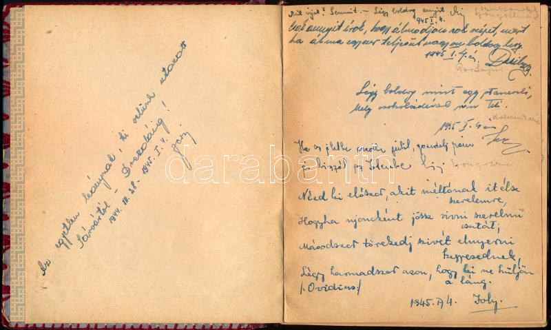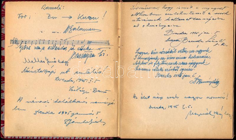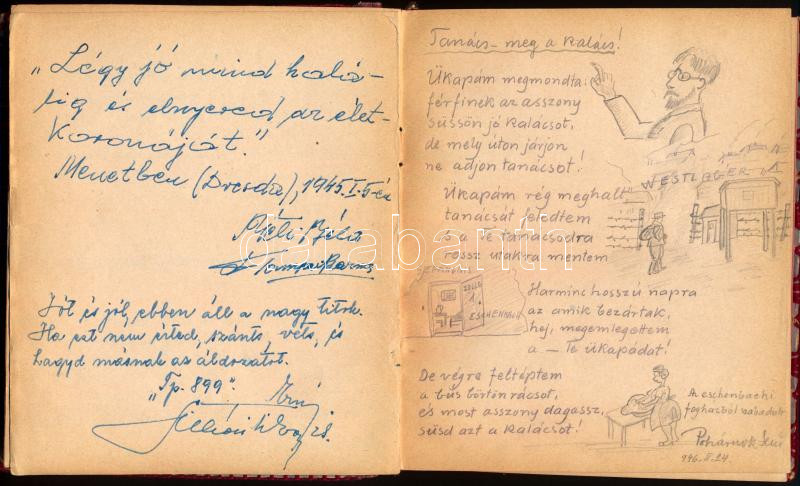 1945-1946 A II. világháború végén Magyarországról Németországba (Sárvárról Drezdába) menekült lány emlékkönyve, benne számos érdekes bejegyzéssel (a nevek melletti rangjelölések alapján több magyar katonáktól, tisztektől származik); az egyik oldalon Pohárnok Jenő (szül. Pohárnik) (1898-1962) költő, író, újságíró saját kezű, verses bejegyzésével, valamint ceruzarajzaival (közte "Westlager" fogolytábort, illetve eschenbachi fogház celláját ábrázoló rajzokkal - utóbbiban beszámolója szerint ő maga raboskodott); összesen 21 oldalnyi bejegyzéssel. Félvászon-kötésben, nagyrészt jó állapotban, egy kijáró lappal.