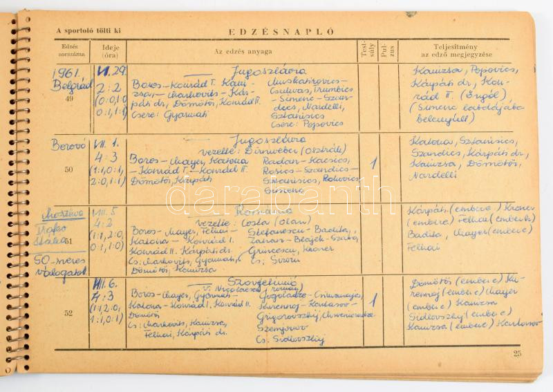 1957-1966 A magyar vízilabda válogatott mérkőzéseinek részletes naplója, az eredményekkel, benne a félidei eredmények, az összes gól szerzőjének nevével, kézzel írt füzetben. Dömötör Zoltán (1935-2019) olimpiai bajnok vízilabdázó, úszó, edző gyűjteménye
