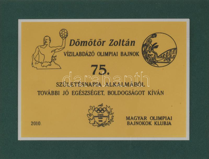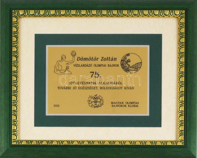 2010 Dömötör Zoltán (1935-2019) olimpiai bajnok vízilabdázó, úszó, edző 75 . Születésnapjára adományozott emlék plakett, a Magyar Olimpiai Bajnokok Klubjától Üvegezett dekoratív keretezéssel Külső méret 35x30 cm