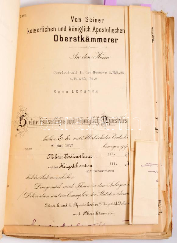 ca 1910-1950 Lechner Egon (1890-1967) gépészmérnök, egyetemi tanár, a műszaki tudományok kandidátusa, Lechner Ödön építész testvére személyes okmányhagyatéka. I. világháborús és azelőtti katonai kinevezési okmányok, előléptetési papírok, katona igazolványok és egyéb más iratok, lefűzve