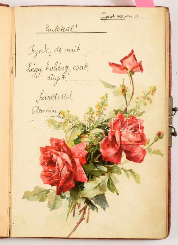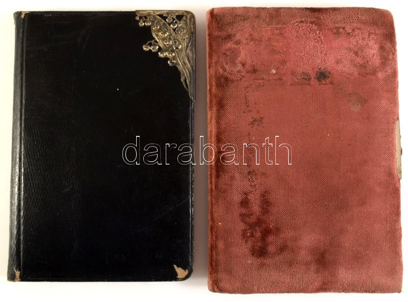 cca 1913-1919 2 db régi emlékkönyv, sok bejegyzéssel, néhány grafikus illusztrált oldallal, egyik kötésén szecessziós fém díszítéssel