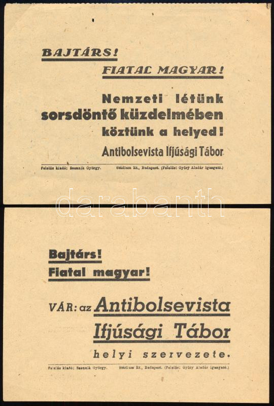 cca 1930 "Bajtárs! Fiatal Magyar!" Antibolsevista Ifjúsági Tábor 2 db röplap, 11x15 cm, 12x15 cm