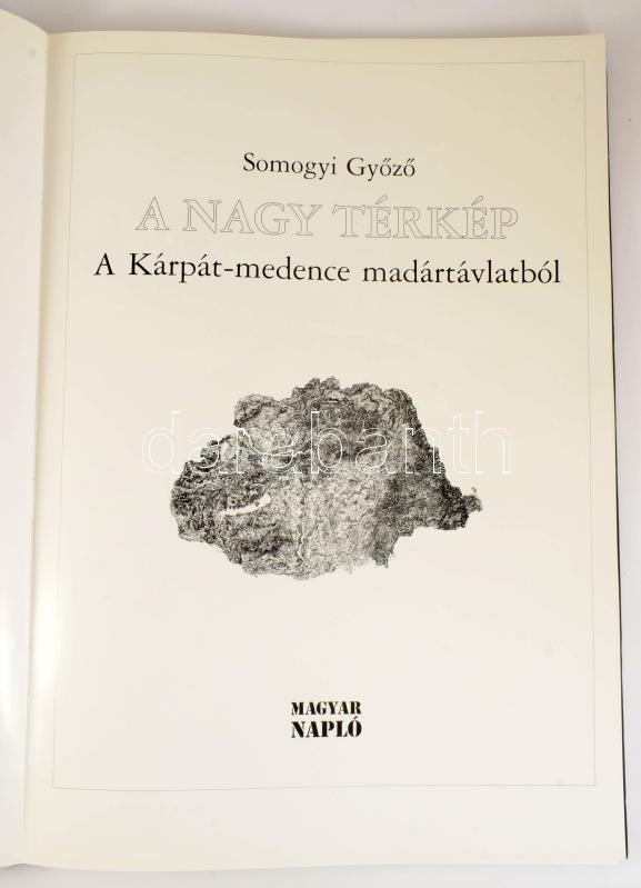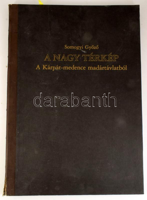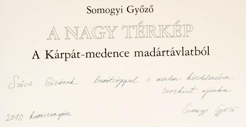Somogyi Győző: A nagy térkép. A Kárpát-medence madártávlatból. A szerző, Somogyi Győző (1942-) a Nemzet Művésze címmel kitüntetett, Kossuth-díjas grafikus és festőművész által DEDIKÁLT példány. Bp., 2003, Magyar Napló, 6+23+3 p. Kiadói félműbőr-kötés, kopott borítóval, sérült gerinccel, 59x41 cm.