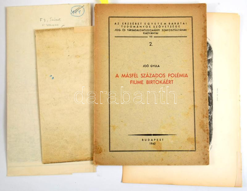 Joó Gyula: A másfél százados polémia Fiume birtokáért. DEDIKÁLT! Erzsébet Egyetem Barátai Tudományos Szövetsége Jog- és Társadalomtudományi Szakosztályának kiadványai VII. 2. Bp., 1942, Szerzői, (Kecskemét, Első Kecskeméti Hírlapkiadó-ny.), 51 p. Kiadói papírkötés, szakadt, foltos borítóval.;