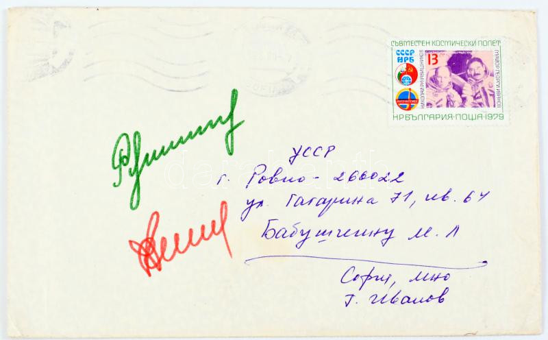 Nyikolaj Rukavisnyikov (1932-2002) szovjet és Georgij Ivanov (1940- ) bolgár űrhajósok aláírásai borítékon / Signatures of Nikolay Rukavishnikov (1932-2002) Soviet and Georgiy Ivanov (1940- ) Bulgarian astronauts on envelope