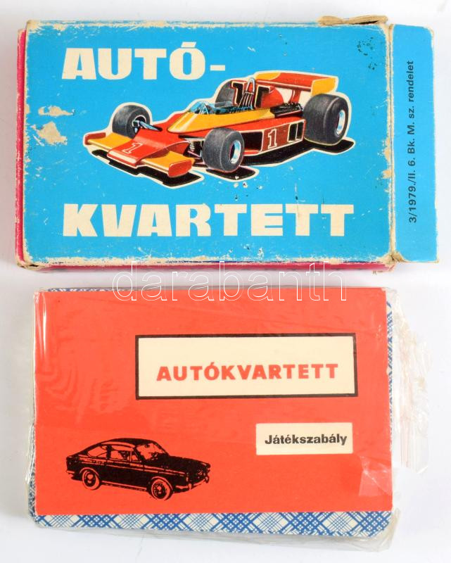 1979 Autókvartett kártyajáték, a lapok bontatlanok, nem használtak, eredeti leírással, eredeti kissé kopott dobozában,