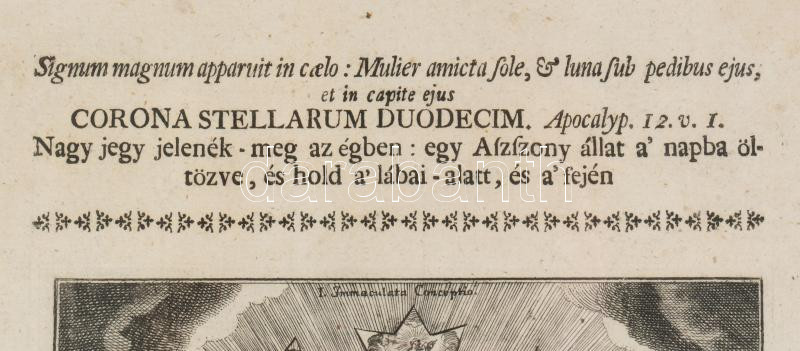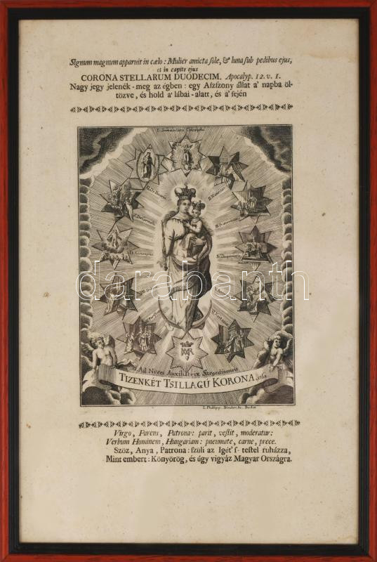 cca 1768 Binder János Fülöp (1735?-1811): "Tizen-két tsillagú korona" Szűz Mária metszet, papír, rézmetszet, jelzett a dúcon, üvegezett fa keretben: 36x24 cm