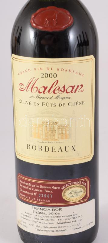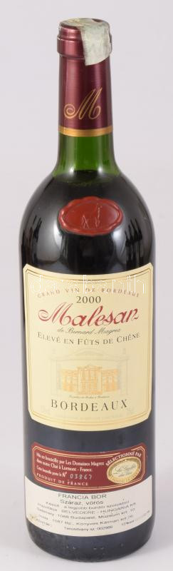 2000 Malesan de Bernard Magrez, számozott (N. 03867), bontatlan palack száraz, Bordeaux-i francia vörösbor, palackozva: 2002-04-29, 12%, 0,75l.