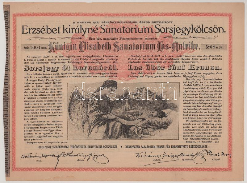 1904. Budapest "Erzsébet királyné Sanatorium Sorsjegykölcsön" sorsjegye 5K értékben, magyar és német nyelven, szárazpecséttel T:F, szakadások