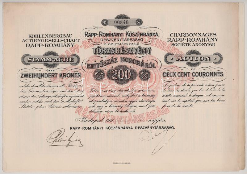 1911. Budapest "Rapp-Romhányi Kőszénbánya Részvénytársaság" részvénye 200K-ról, szelvényekkel, szárazpecséttel T:AU