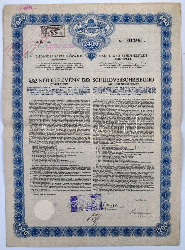 1914. Budapest "Budapest Székesfőváros" 4 1/2%-os Kötelezvény bemutatóra 2400K-ról két nyelven, szárazpecséttel, felülbélyegzésekkel, szelvényekkel T:VF