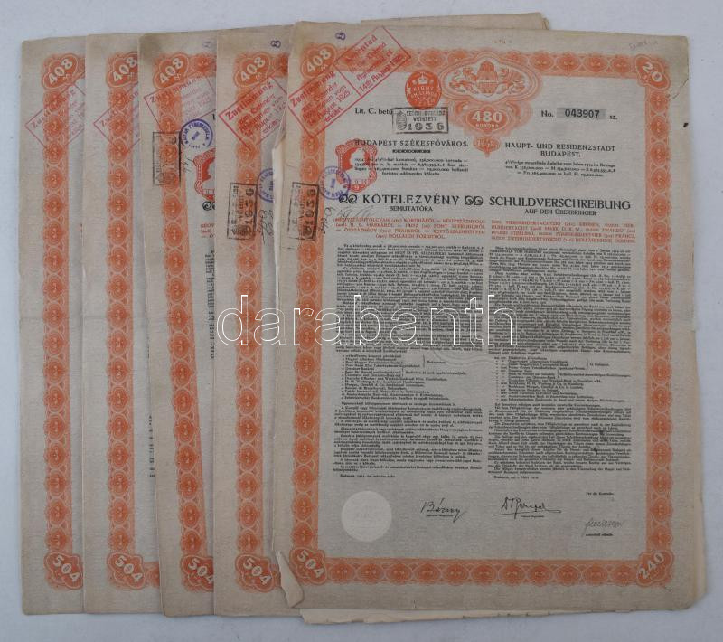 1914. Budapest "Budapest SzékesfÅ‘város" 4 1/2%-os kötelezvény bemutatóra 480K-ról, magyar és német nyelven, szárazpecséttel, felülbélyegzésekkel, szelvényekkel, vÃzjeles papÃron (5x), közte sorszámkövetÅ‘k "056928 - 056929" T:F-G