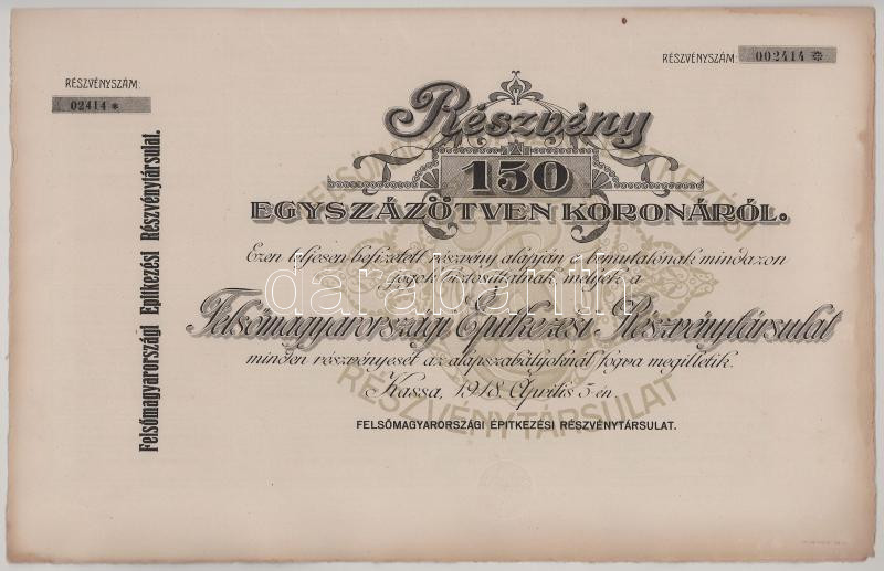 1918. Kassa "Felsőmagyarországi Építkezési Részvénytársulat" részvénye 150K-ról, szárazpecséttel, szelvényekkel T:AU