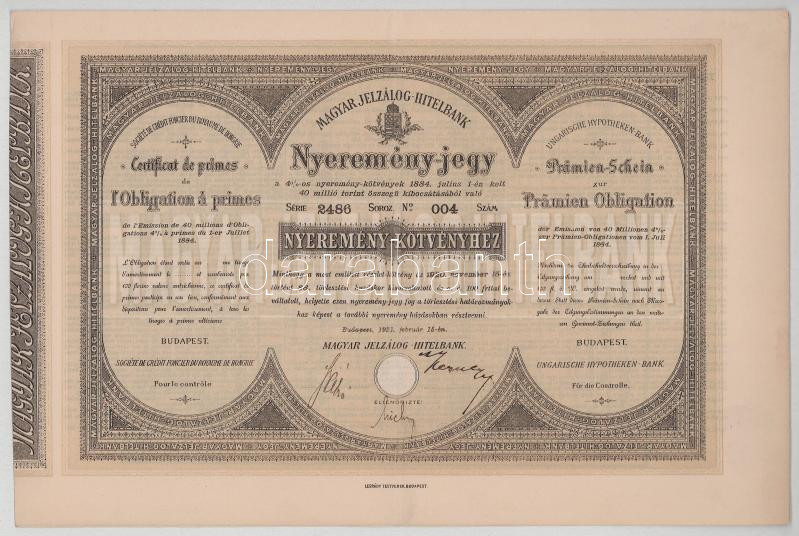 1921. Budapest "Magyar Jelzálog Hitelbank" nyeremény jegye "2486 004" T:XF
