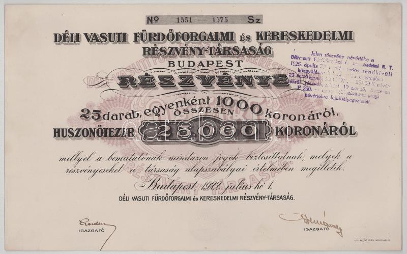 1922. Budapest "Déli Vasuti Fürdőforgalmi és Kereskedelmi Részvénytársaság Budapest" 25db részvénye egyben, összesen 25000K-ról "1551-1575", szárazpecséttel, szelvényutalvánnyal, bélyegzésekkel T:AU,XF