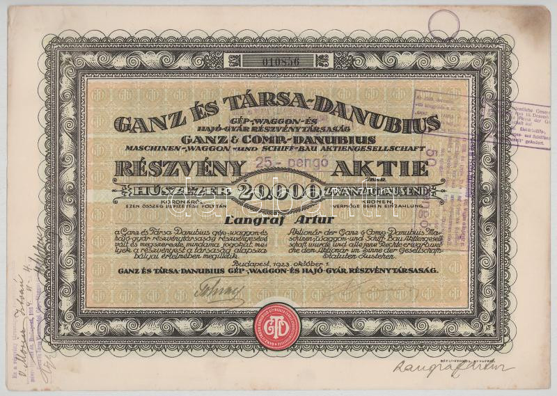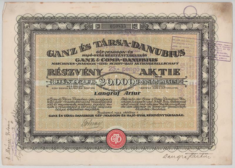 1923. Budapest "Ganz és Társa- Danubius Gép-, Waggon- és Hajó-Gyár Részvénytársaság" részvénye 20.000K-ról, magyar és német nyelven (2x) sorszámkövetők "010855-010856", szárazpecséttel, bélyegzésekkel és szelvényekkel T:F