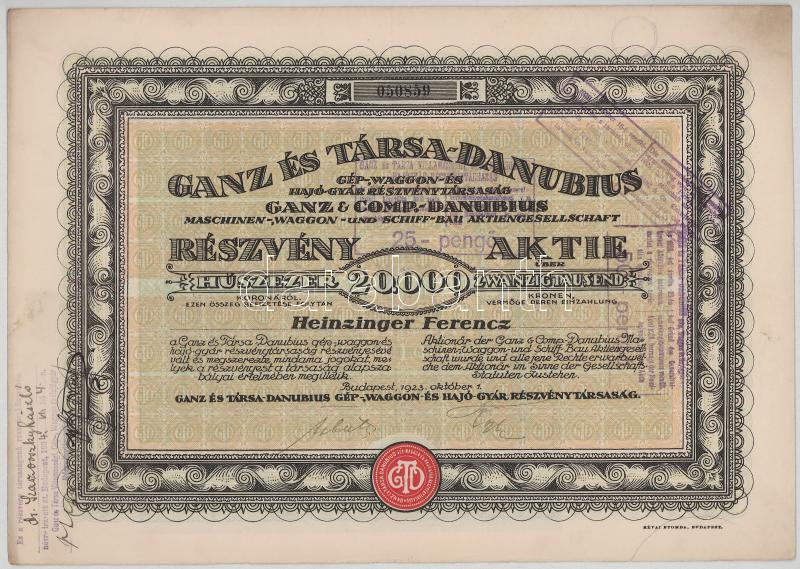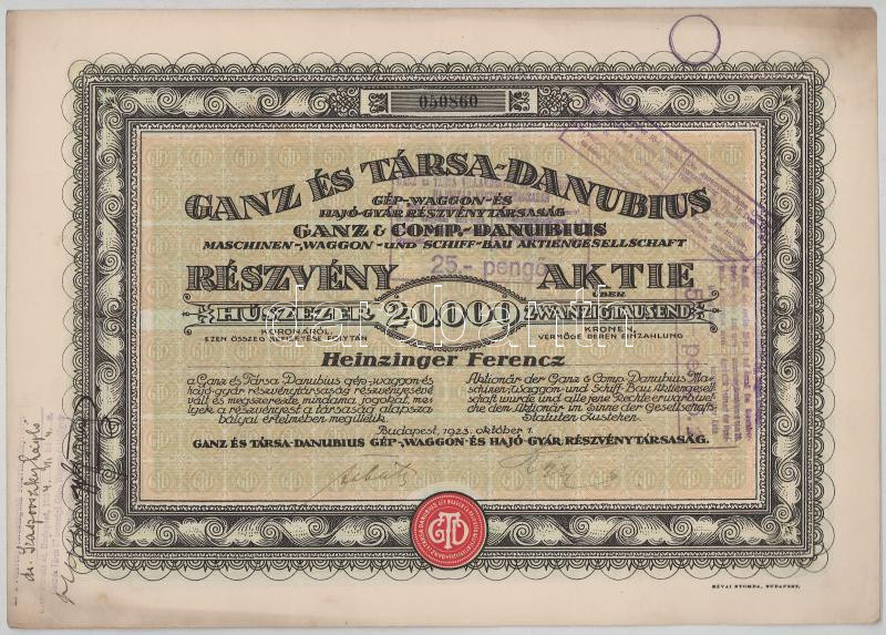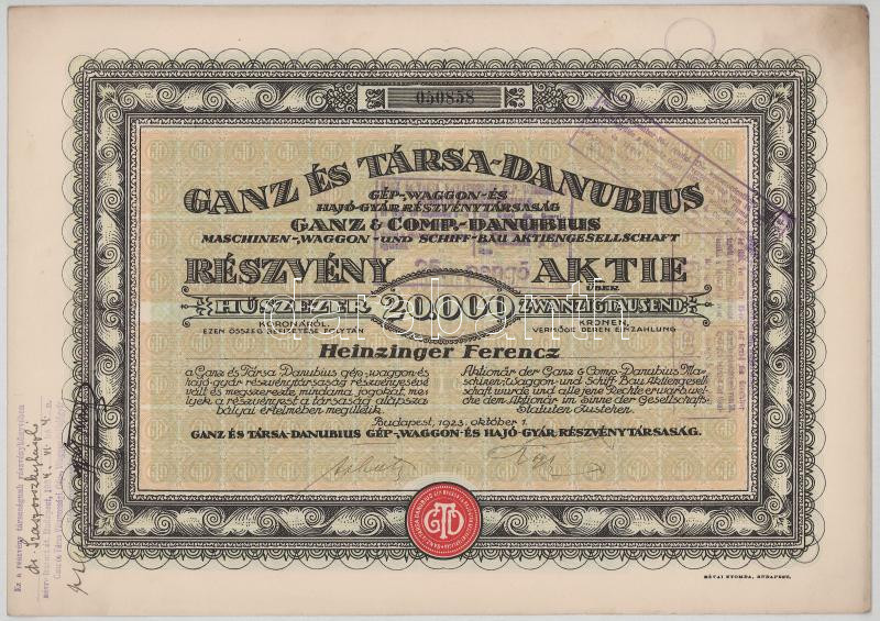 1923. Budapest "Ganz és Társa- Danubius Gép-, Waggon- és Hajó-Gyár Részvénytársaság" részvénye 20.000K-ról, magyar és német nyelven (3x) sorszámkövetők "050858-050860", szárazpecséttel, bélyegzésekkel és szelvényekkel T:F