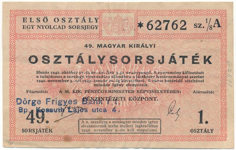 1942. "49. Magyar Királyi Osztálysorsjáték" 1. osztály egynyolcad sorsjegye "A", felülbélyegzéssel T:F