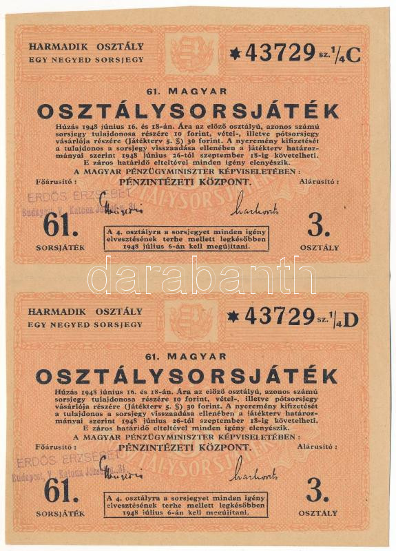 1948. "61. Magyar Osztálysorsjáték" 3. osztály egynegyed sorsjegye (2x) "C" + "D" vágatlan ívben, felülbélyegzéssel T:XF, ceruzás firka