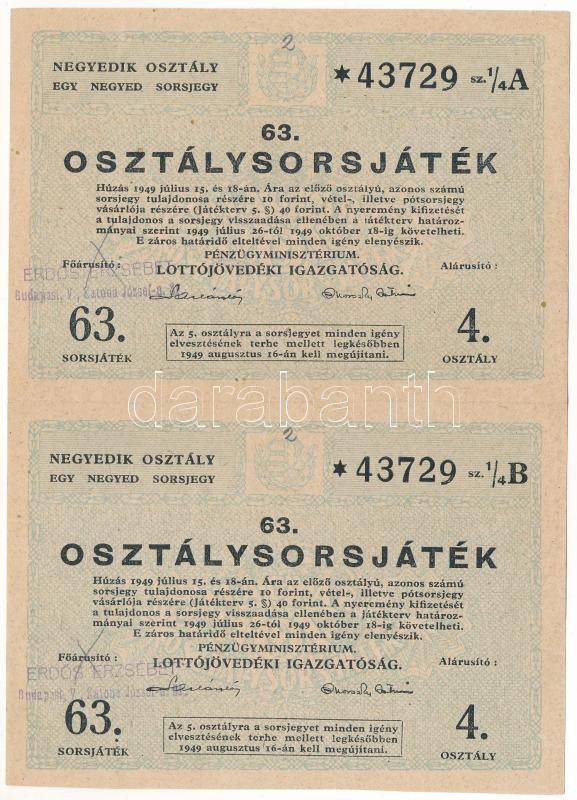 1949. "63. Osztálysorsjáték" 4. osztály egynegyed sorsjegye (2x) "A" + "B" vágatlan ívben, felülbélyegzéssel T:XF, ceruzás firka