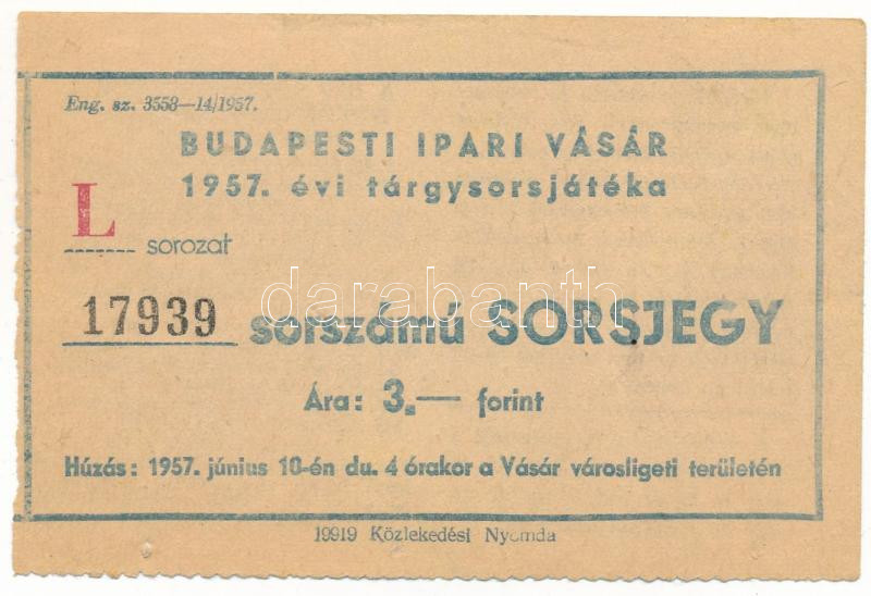1957. "Budapesti Ipari Vásár" tárgysorsjáték sorsjegye 3Ft értékben "L sorozat" T:F tűlyukak, pici szakadások, egyébként szép papír
