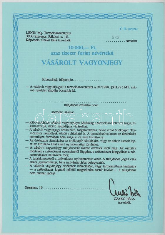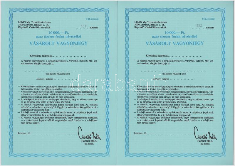 1970 k. 19(...) "Lenin Mg. Termelőszövetkezet" vásárolt vagyonjegy 10.000Ft-ról, kitöltetlen (3x) sorszámkövetők T:AU