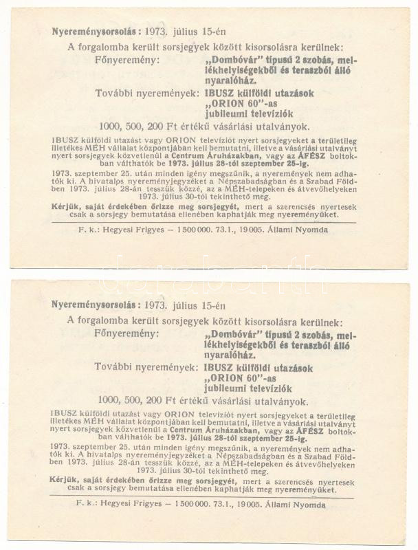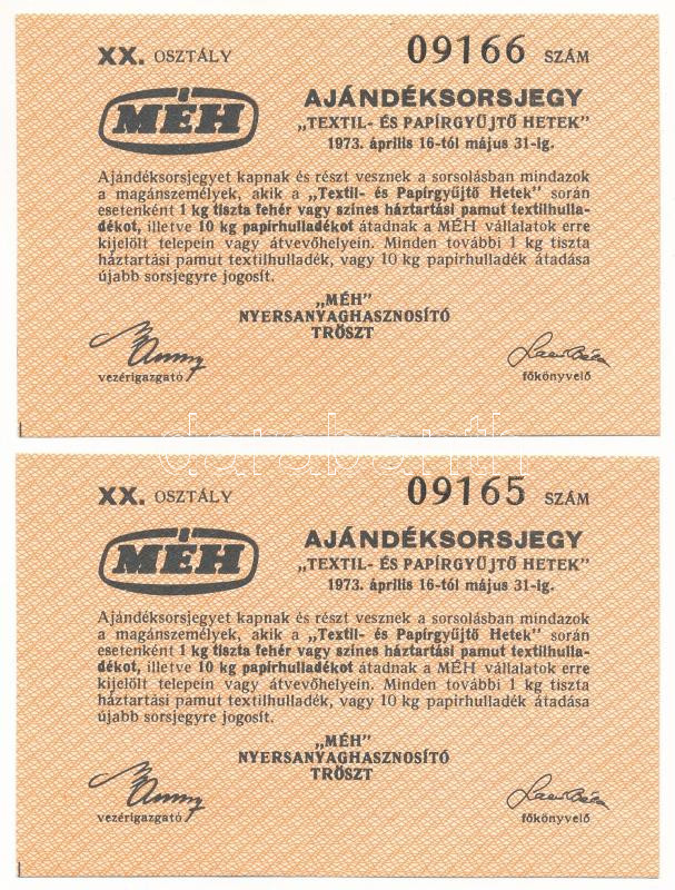 1973. "Ajándéksorsjegy - Textil- és papírgyűjtő hetek" az Észak-Magyarországi "MÉH" Nyersanyaghasznosító Vállalat sorsjegye magánszemélyek részére 1kg leadott pamut textilhulladék, 10kg leadott papírhulladék után (2x) sorszámkövetők "09165-09166" T:AU
