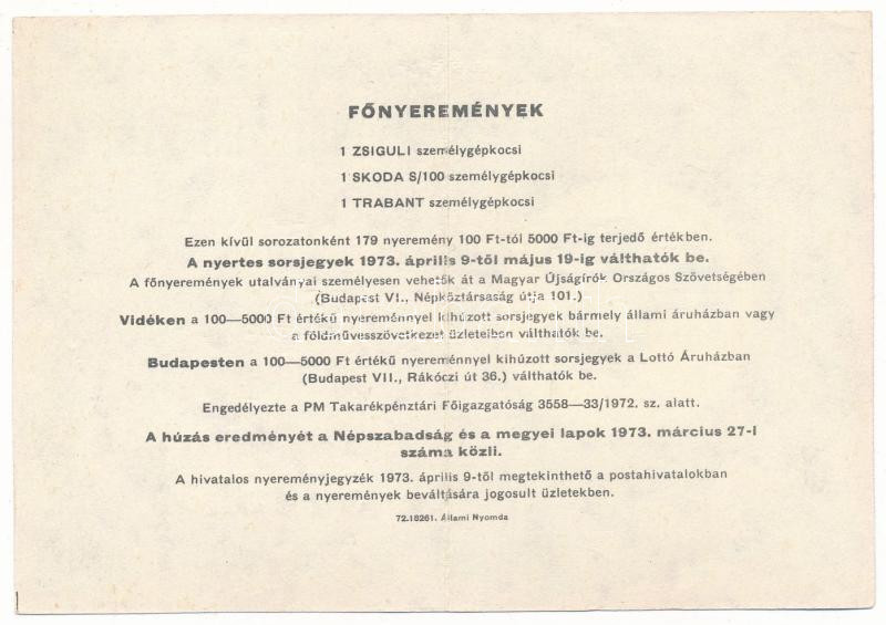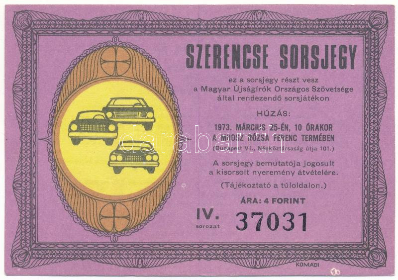 1973. "Szerencse Sorsjegy" a Magyar Újságírók Országos Szövetsége által rendezett sorsjáték IV. osztályú sorsjegye, 4Ft értékben "37031" T:XF