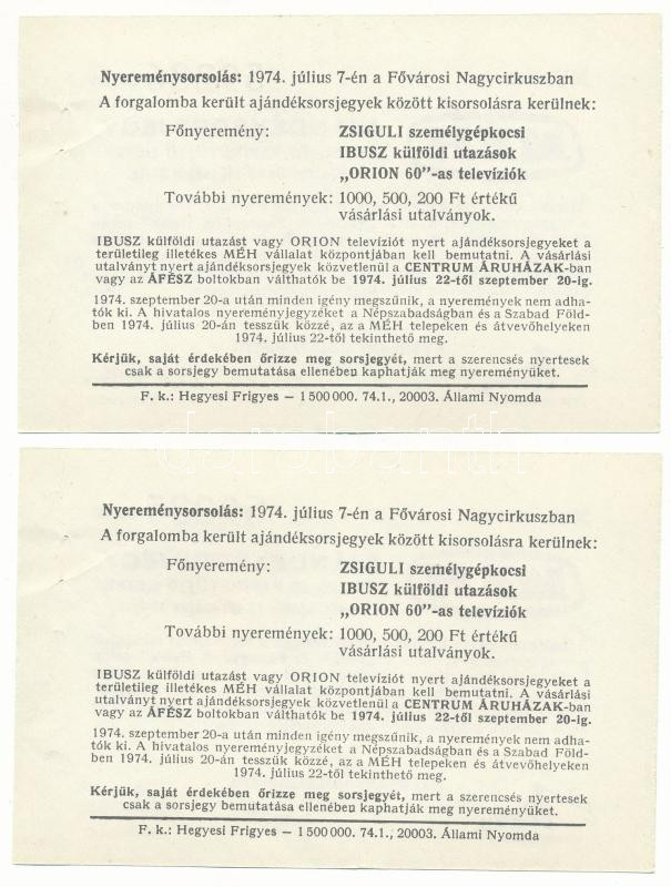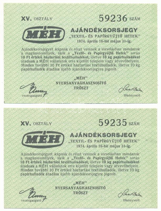 1974. "Ajándéksorsjegy - Textil- és papírgyűjtő hetek" az Észak-Magyarországi "MÉH" Nyersanyaghasznosító Vállalat sorsjegye magánszemélyek részére 10Ft értékű leadott textilhulladék, 10kg leadott papírhulladék után (2x) sorszámkövetők "59235-59236" T:XF tűlyukak