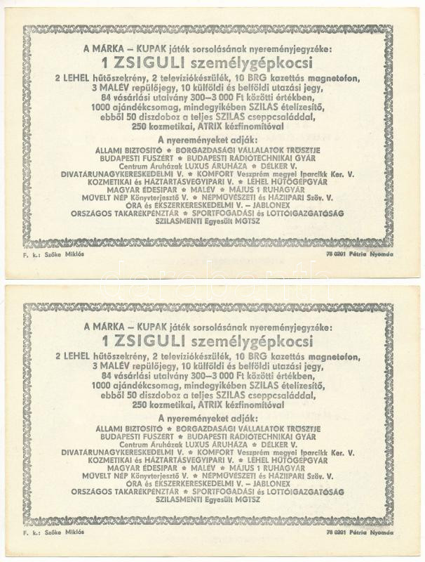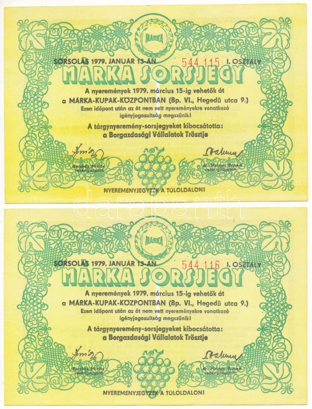 1979. "Márka Sorsjegy" (2x) Borgazdasági Vállalatok Trösztjének sorsjátéka "I. osztály", sorszámkövetők "544 115 - 544 116" T:AU