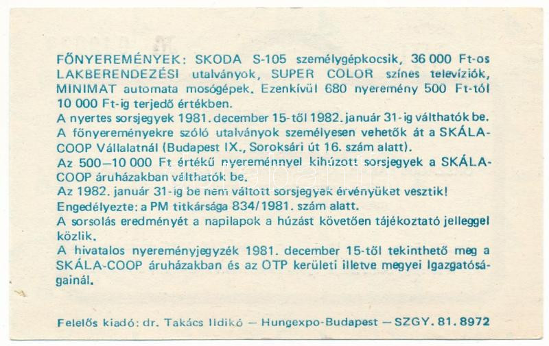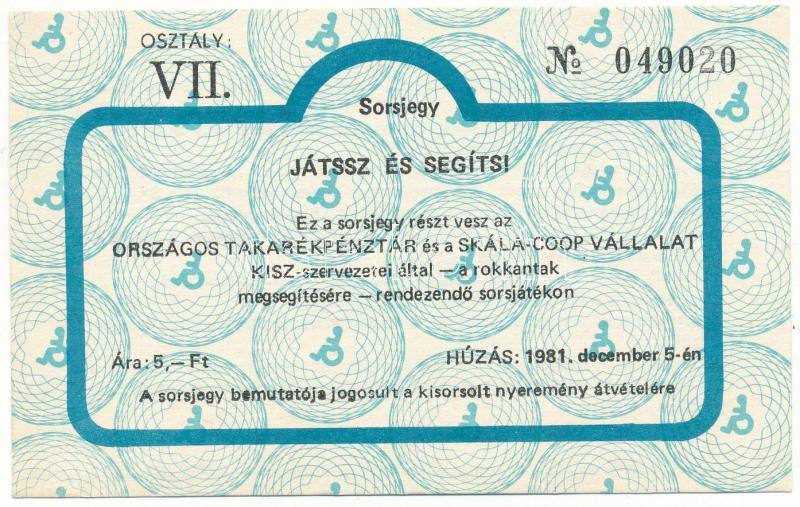 1981. "Játssz és segíts!" az Országos Takarékpénztár és a Skála-Coop Vállalat KISZ-szervezetei által rendezett sorsjáték VII. osztályú sorsjegye, 5Ft értékben T:AU