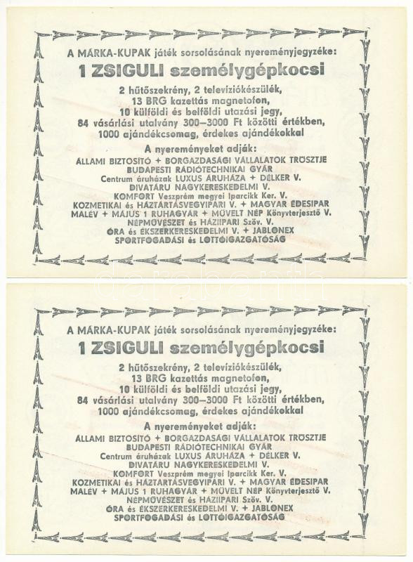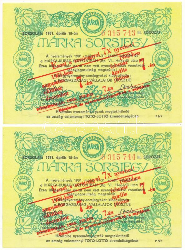 1981. "Márka Sorsjegy" (2x) a Borgazdasági Vállalatok Trösztje sorsjegye, III. sorozat, "Ezzel a sorsjeggyel 7x nyerhet!" felülbélyegzéssel, sorszámkövetők "0 315 743 - 0 315 744" T:AU