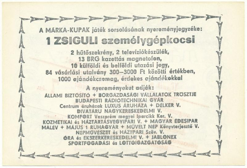 1981. "Márka Sorsjegy" a Borgazdasági Vállalatok Trösztje sorsjegye, III. sorozat, "Ezzel a sorsjeggyel 7x nyerhet!" felülbélyegzéssel T:AU kis sarokhajlás