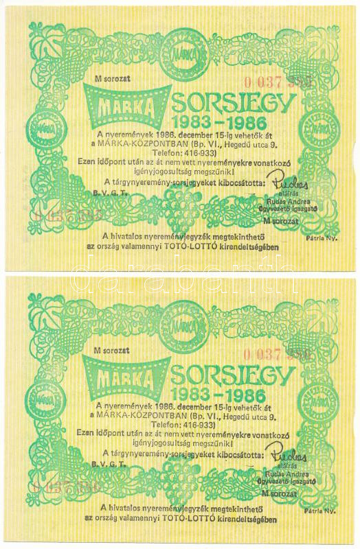 1986. "Márka Sorsjegy 1983-1986" (2x) Borgazdasági Vállalatok Trösztjének sorsjátéka, sorszámkövetők "M 0 037 385 - 0 037 386" T:AU