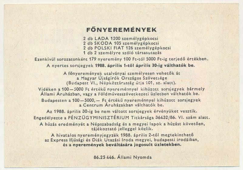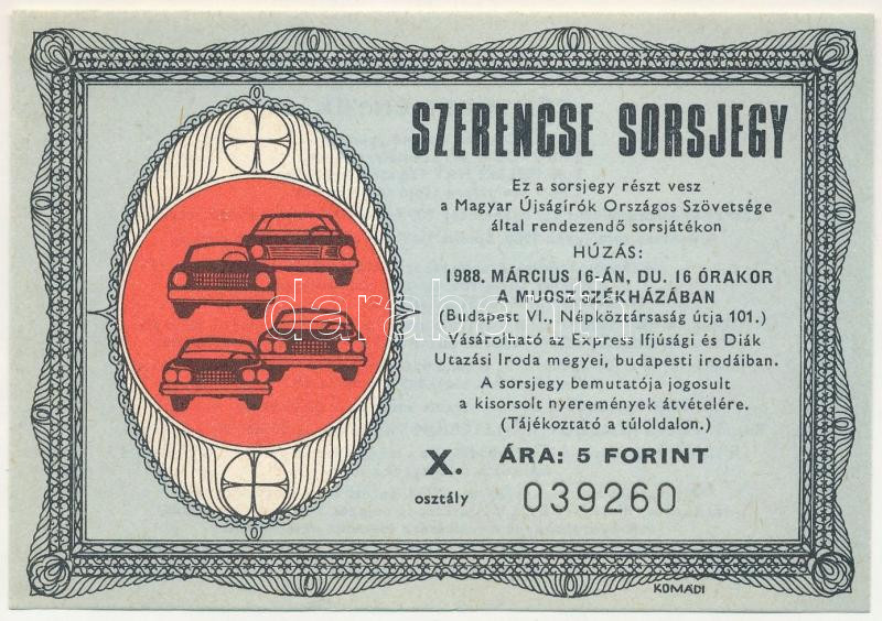 1988. "Szerencse Sorsjegy" a Magyar Újságírók Országos Szövetsége által rendezett sorsjáték X. osztályú sorsjegye, 5Ft értékben T:AU