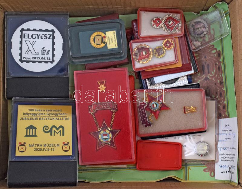 17db-os szocialista kitüntetés-, jelvény-, plakett-tétel, közte több bélyeggyűjtéssel kapcsolatos darab, valamint 2db oklevél. Benne: 1970. "Szakszervezetek Országos Tanácsa" műgyantás bronz fokozatának kitüntetése szalaggal, szalagsávon miniatűrrel T:vegyes