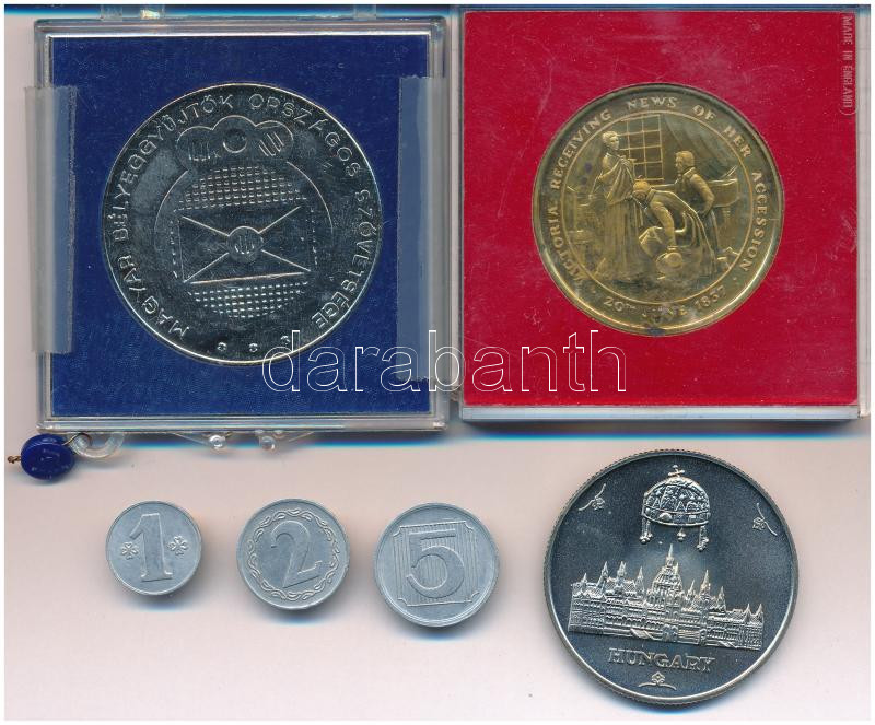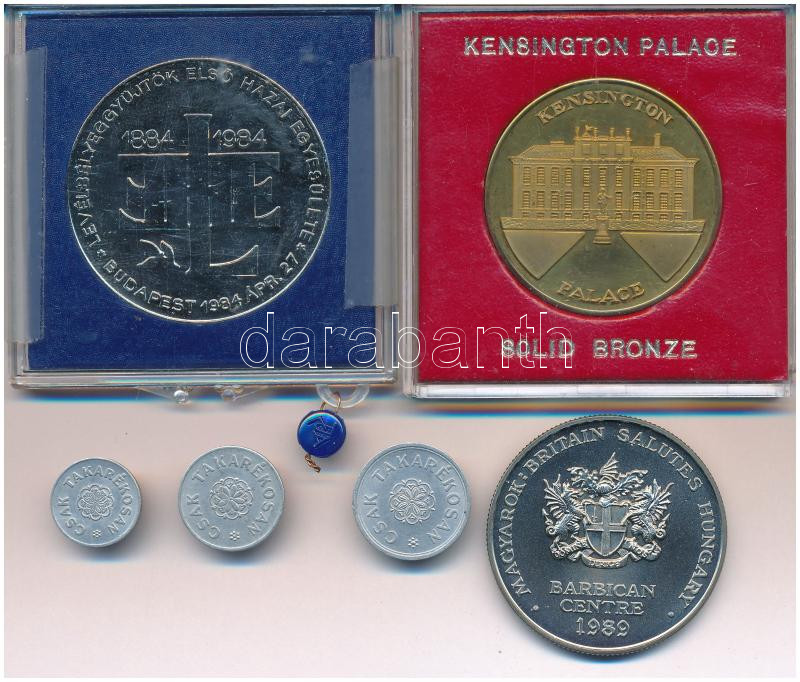 6db-os vegyes tétel, benne 1-2-5 értékű "Csak takarékosan" Al zseton, MABÉOSZ fém emlékérem, "Kensington Palace" emlékérem, "Országgyűlés / Barbican Centre" emlékérem T:vegyes