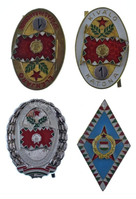 1970-1980 k. "Élenjáró Századparancsnok - 1. osztály" (41x27mm) + "Zrínyi Miklós Katonai Akadémia" (46x27mm) + "Kiváló Katona - 1. osztály" (41x27mm) rátétes, műgyantás bronz sapkajelvények + "Élenjáró Századparancsnok" ezüstözött műgyantás sapkajelvény (40x31mm) T:AU